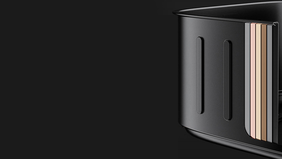 Конструкция аэрогриля включает в себя несколько уровней покрытий: износостойкое антипригарное покрытие на внешнем корпусе, антипригарное покрытие с внутренней стороны, усиленный защитный слой, основной слой из сплава, износостойкое антипригарное покрытие внутри и снаружи.