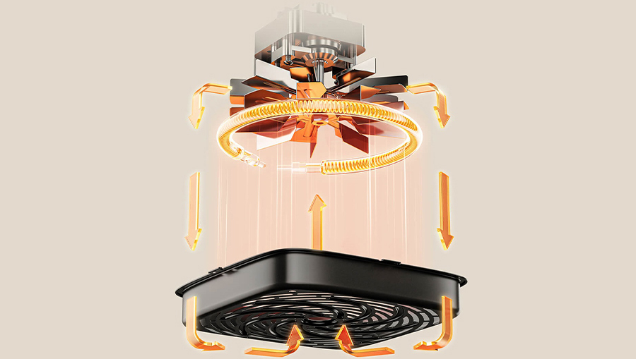 Вентилятор оснащен 9-тью двукрылыми спиральными лопастями. Воздух циркулирует с максимальной скоростью 2350 об/мин. Это позволяет создать мощный поток горячего воздуха, который равномерно распределяет тепло по всей поверхности продуктов. 3D вращающая ветровая корзина для жарки под углом наклона 360° обеспечивает непрерывный обдув горячим воздухом. Ингредиенты внутри становятся идеально приготовлены.