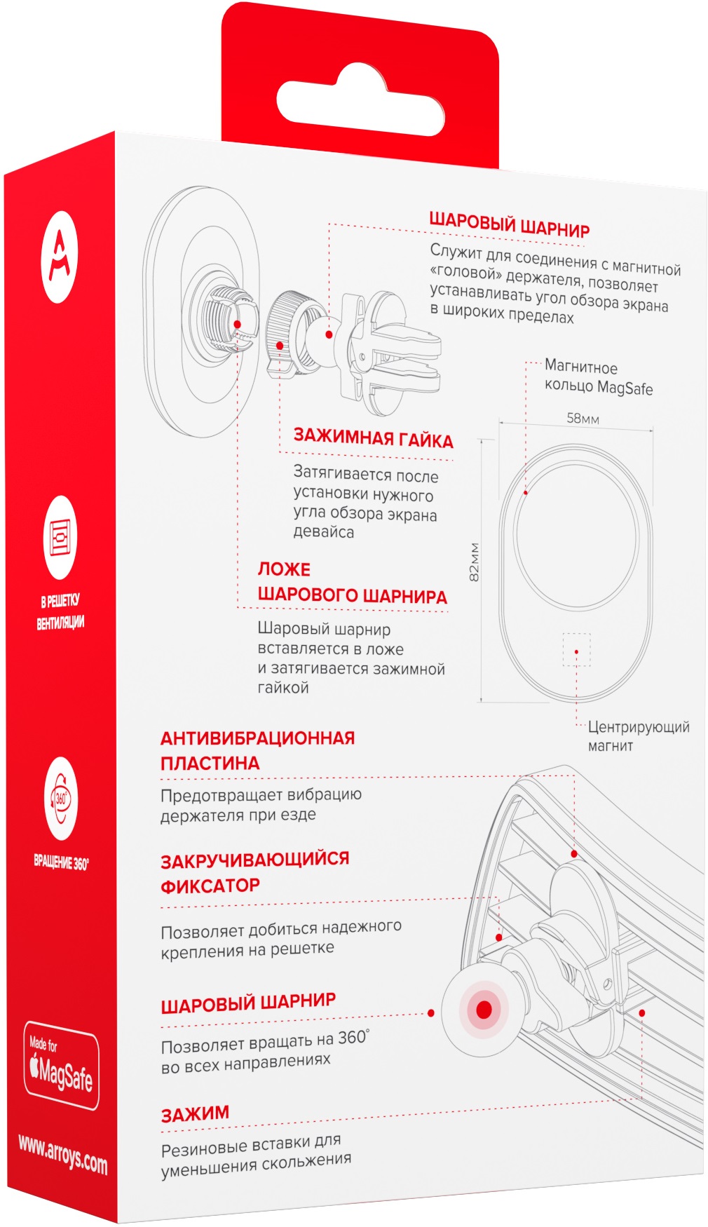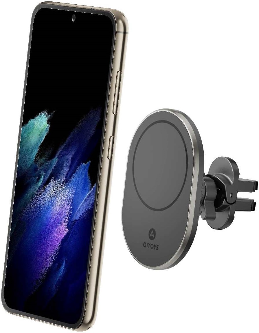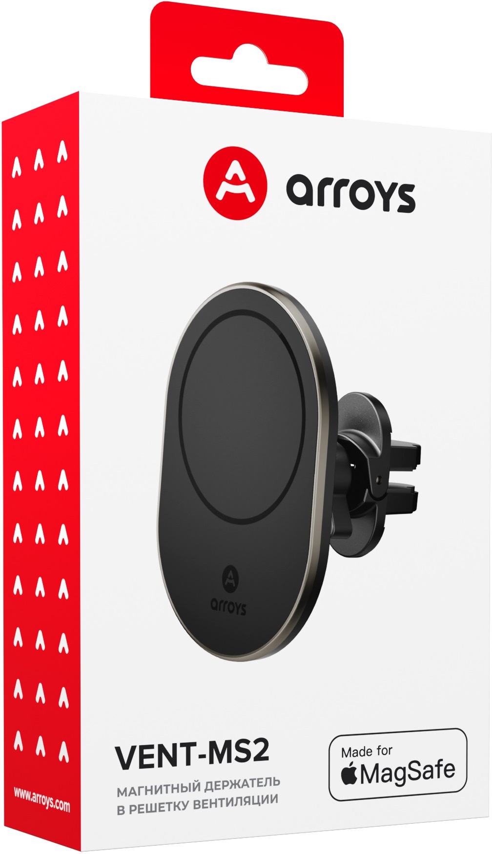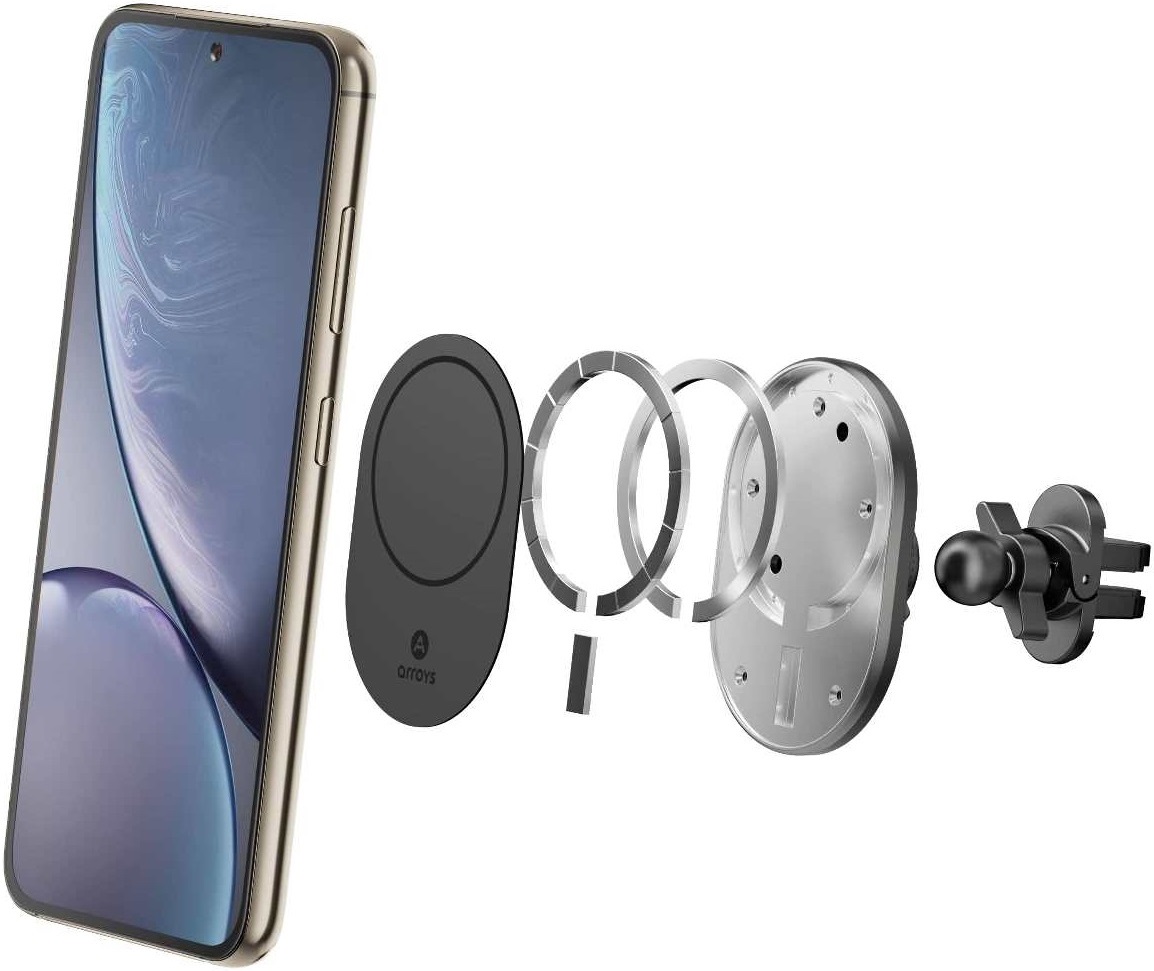 Компания Arroys выпустила новую модель Vent-MS2, предназначенную для использования с телефонами или чехлами с креплением Magsafe. Встроенное в держатель магнитное кольцо обеспечивает крепление телефона на держателе. Фиксаторы MagSafe устанавливаются на iPhone, начиная с серии 12, также встречаются чехлы с таким креплением. В обоих случаях телефон можно устанавливать на держатель без дополнительных приспособлений. В держатель вмонтирован центрирующий магнит, ответная часть к которому находится в iPhone. Он дает возможность выровнять и зафиксировать iPhone по вертикали.