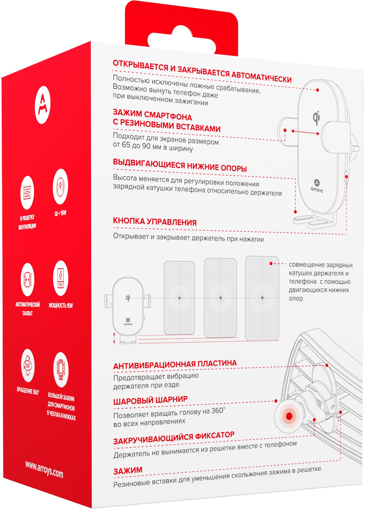 Нижние опоры могут перемещаться по вертикали, они имеют три положения. Это сделано для того, чтобы совместить центр телефона с зарядной катушкой держателя. Только в этом случае заряд будет максимально быстр, а нагрев телефона минимален.