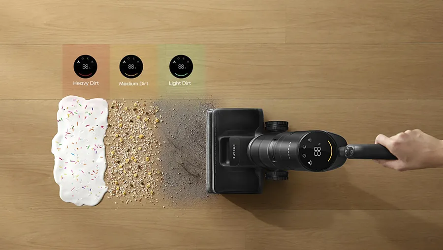 Универсальный помощник имеет встроенный умный датчик для обнаружения грязи. И в зависимости от сложности задачи подбирается оптимальная мощность. Так энергия не тратится зря, при этом пол очищается до блеска. А в ходе уборки дисплей подскажет вам, насколько загрязнен тот или иной участок. Красный цвет означает, что грязи много. Оранжевый — говорит о средней загрязненности. А зеленый — о легком засорении.