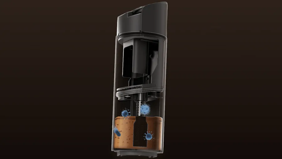 Щетка H12 Pro Flex самоочищается в горячей воде под температурой 90 градусов за Цельсием для удаления масляных пятен и сложных пятен. Затем щетка вращается на высокой скорости и сушится горячим воздухом в течение 5 минут, удаляя излишки воды и предотвращая появление запаха и размножение бактерий.