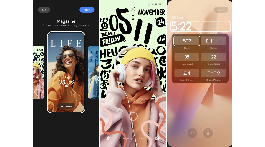 Далее, бренд внедряет многочисленные дизайны экранов блокировки с отменной анимацией прокрутки. Кроме того, пользователи могут выбирать между классическими, ромбовидными и журнальными экранами блокировки.