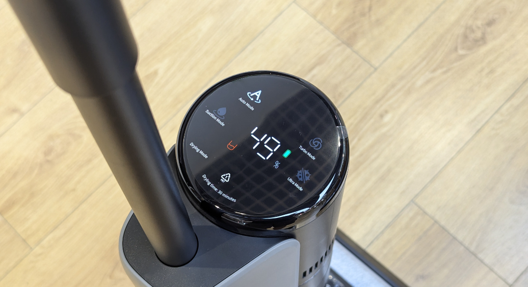 В верхней части корпуса находится светодиодный экран. На дисплее отображается уровень заряда батареи и выбранный режим очистки. Вокруг экрана имеется светодиодное кольцо, которое меняет цвета в зависимости от степени загрязнения: зеленое, когда полы слегка грязные, оранжевое, когда полы достаточно загрязнены, или красное, если степень загрязнения слишком высокая. Также на экране сообщается, когда пора опорожнять бак с утилизированной водой или пополнять резервуар с чистой, и все это сопровождается голосовыми подсказками через динамик на обратной стороне корпуса. Как и предшественник, Dreame H13 Pro Wet and Dry Vacuum не подключается к смартфону и не имеет поддержки приложения, поэтому экранные индикации и аудиосообщения – это единственный способ взаимодействия с устройством.