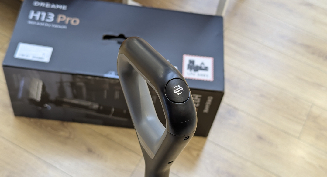 Рукоять имеет классическую конструкцию с треугольной верхней ручкой, на которой расположены три кнопки, одна из которых находится на верхней части и предназначена для запуска самоочистки. Две других естественным образом ложатся под большой палец руки в ходе уборки, что позволяет включать и выключать пылесос, а также переключаться между доступными режимами работы.