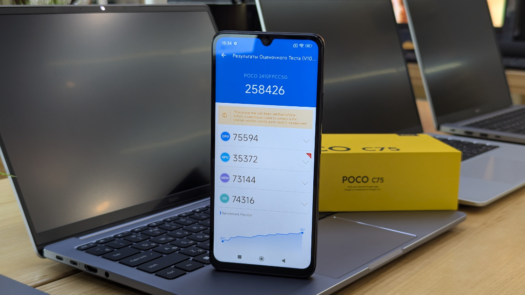 Бенчмарк AnTuTu показал совокупную оценку производительности POCO С75 на уровне 258 426 тысяч баллов, но производительность — это не только о мощности. Важно, как устройство ведет себя при длительном использовании. Мы немного забежим вперед, но отметим, что Helio G81 Ultra построен на 12-нм техпроцессе, что помогает эффективно расходовать энергию, а в связке с внушительной батареей это дает отличный результат, но детальнее об этом чуть позже,