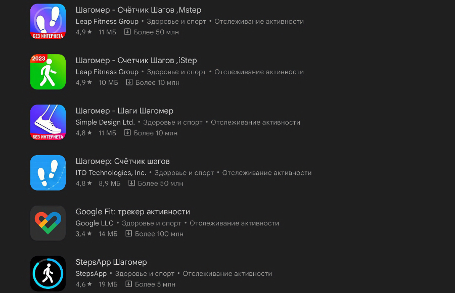 Оба приложения доступны для бесплатного скачивания в магазинах приложений Android и iOS. Вообще приложений, позволяющих вести подсчет пройденных шагов, достаточно много, некоторые даже могут самостоятельно установить необходимый лимит шагов в день, опираясь на параметры тела пользователя. Многие из этих приложений имеют весьма высокие оценки, просто вбейте в строку поиска в Google Play слово «шагомер» – перед вами появится огромный перечень софта, способного выполнять данную функцию.