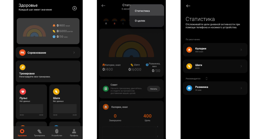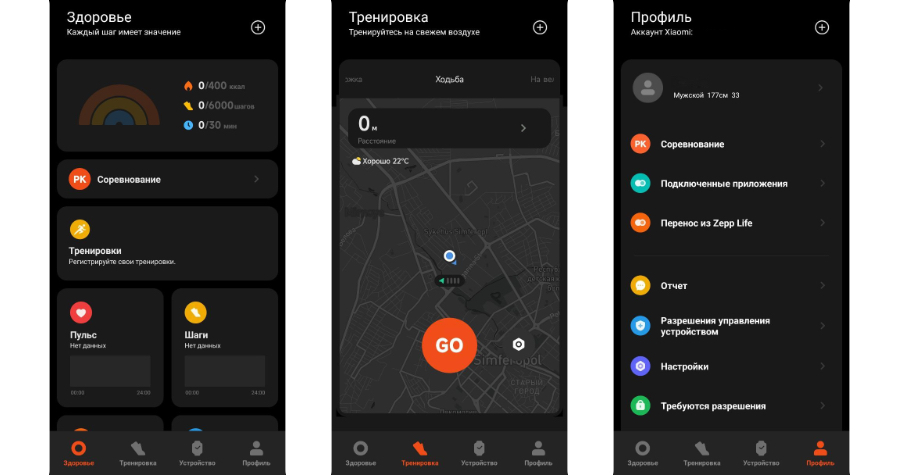 5. На главном экране в нижней части Mi Fitness есть четыре вкладки: «Здоровье», «Тренировка», «Устройство» и «Профиль». В разделе «Здоровье» в отделе «Шаги» можно просматривать статистику за разные дни, а в «Тренировке» можно запустить определение шагов вручную, например, если вы отправляетесь на прогулку. Если вы хотите подкорректировать указанные ранее рост и вес, это можно сделать в «Профиле».