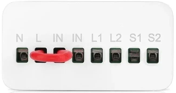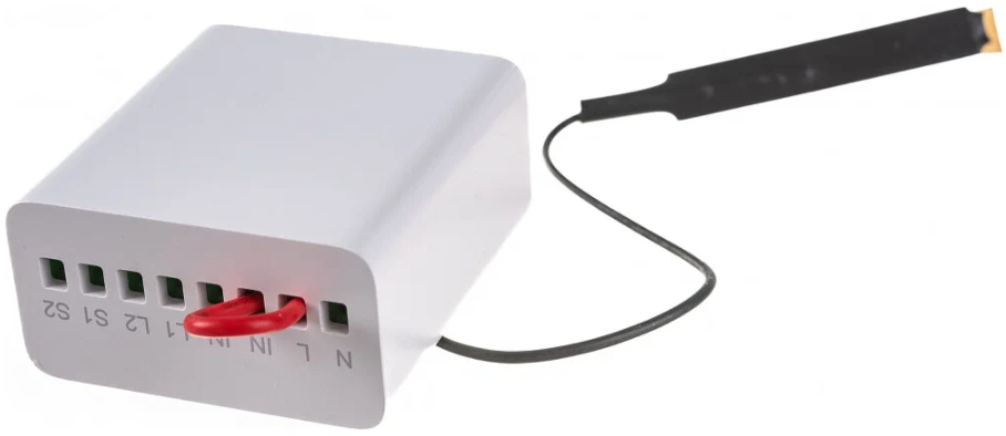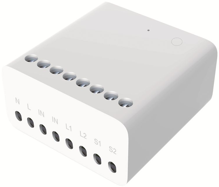 Реле выполнено в форме минималистичного белого прямоугольника со сглаженными краями. На поверхности корпуса размещены 8 слотов винтовых контактов, в числе которых: слот подключения к нулевой линии, замкнутые контакты L и IN, подключение входящей фазы, два контакта с фазой для нагрузки и два контакта для подключения переключателя. С обратной стороны расположена внешняя Zigbee антенна для повышения качества связи. На лицевой стороне присутствует кнопка сопряжения и индикатор активности, который сигнализирует о состоянии устройства.