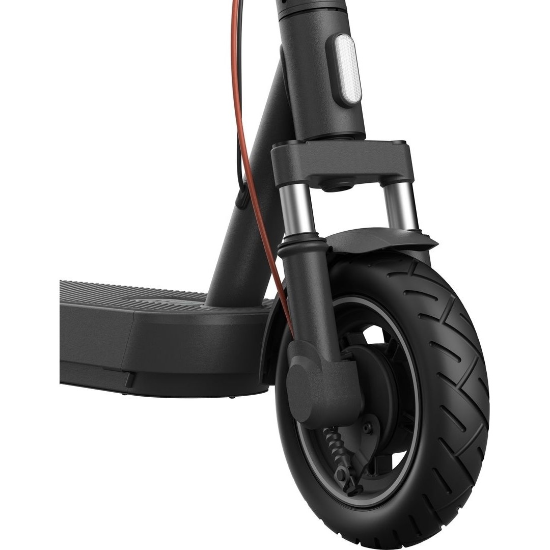 Самокат оснащен безопасными 10-дюймовыми бескамерными шинами, которые спроектированы с максимально доступной герметичностью, оставаясь прочными даже после проезда серьезных препятствий. Они обеспечивают превосходную амортизацию. Широкая площадь контакта колес с покрытием обеспечивает надежное сцепление на поворотах, гарантируя повышение безопасности и стабильности проезда.
