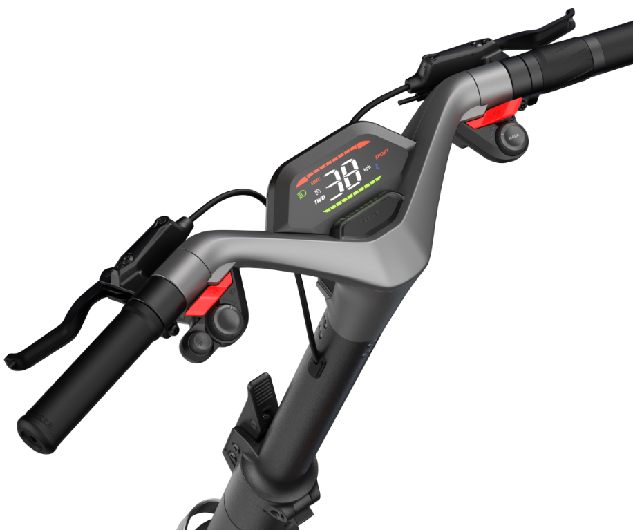 В новом электросамокате установлен полноценный цифровой светодиодный дисплей. На нем отображается такая информация, как скорость, мощность двигателя, оставшийся заряд батареи, режим езды и статус осветительных приборов.