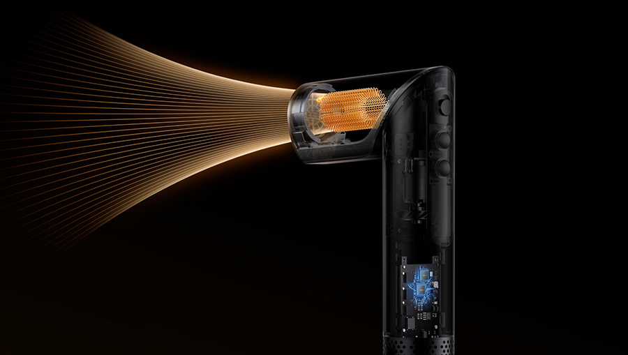 Фен оснащён мощным мотором с высокой скоростью вращения до 110 000 оборотов в минуту, что позволяет создавать интенсивный воздушный поток со скоростью до 65 метров в секунду. Такая мощность обеспечивает сверхбыструю сушку волос, благодаря чему даже густые и длинные пряди высыхают всего за несколько минут.