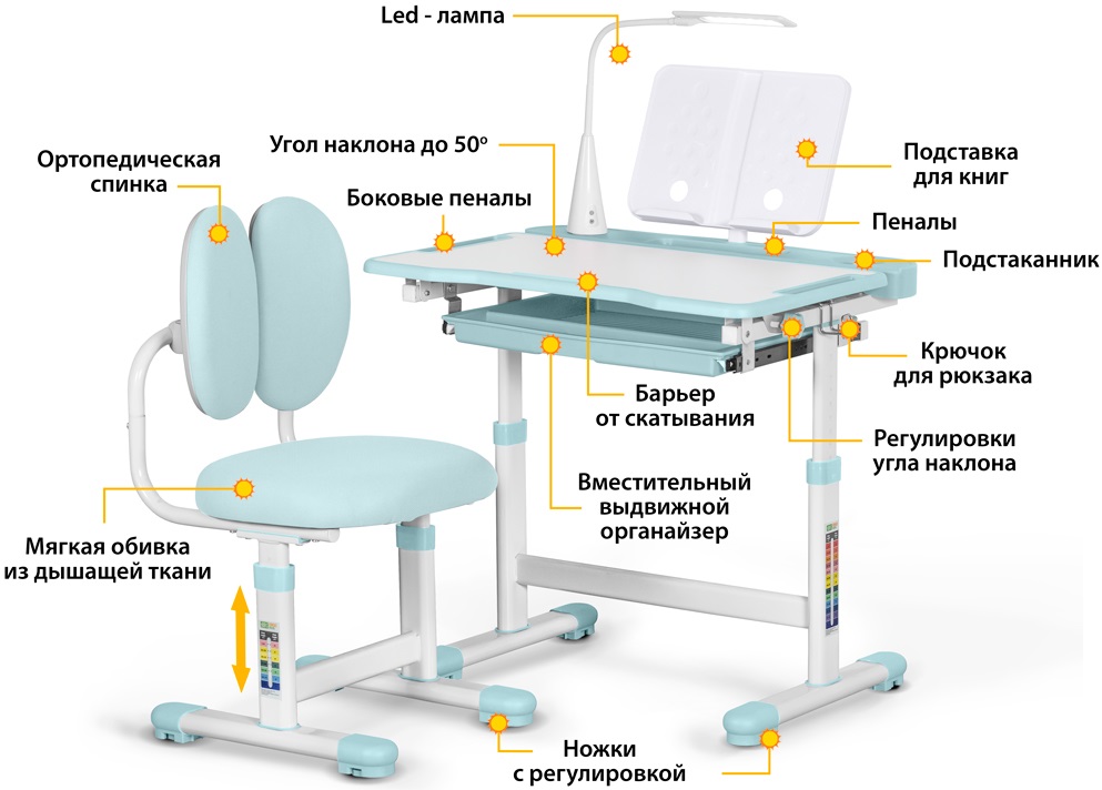 Высота столика меняется ступенчато. Шкала соотношения роста ребенка к высоте столика поможет правильно подобрать параметры Данный комплект подходит для детей от 3-х лет и до раннего подросткового возраста.