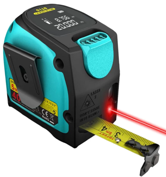 В рулетки предусмотрено два способа измерения: с помощью классической ленты на 5 метров и с помощью лазера на длину до 60 метров c точностью до 2 мм.