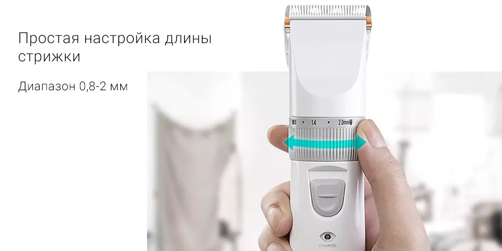 Длина стрижки регулируется в пределах от 0,8 до 2 мм. Вместе с триммером поставляются 4 насадки, что делает его более универсальным и эффективным в применении. Управление осуществляется с помощью одной кнопки.