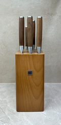 Для хранения комплекта предусмотрена деревянная подставка, которая имеет дорогой и презентабельный дизайн. Удобная наклоненная форма позволит с комфортом вынимать ножи, чтобы сразу же использовать их. Инструменты станут прекрасным дополнением любого кухонного интерьера