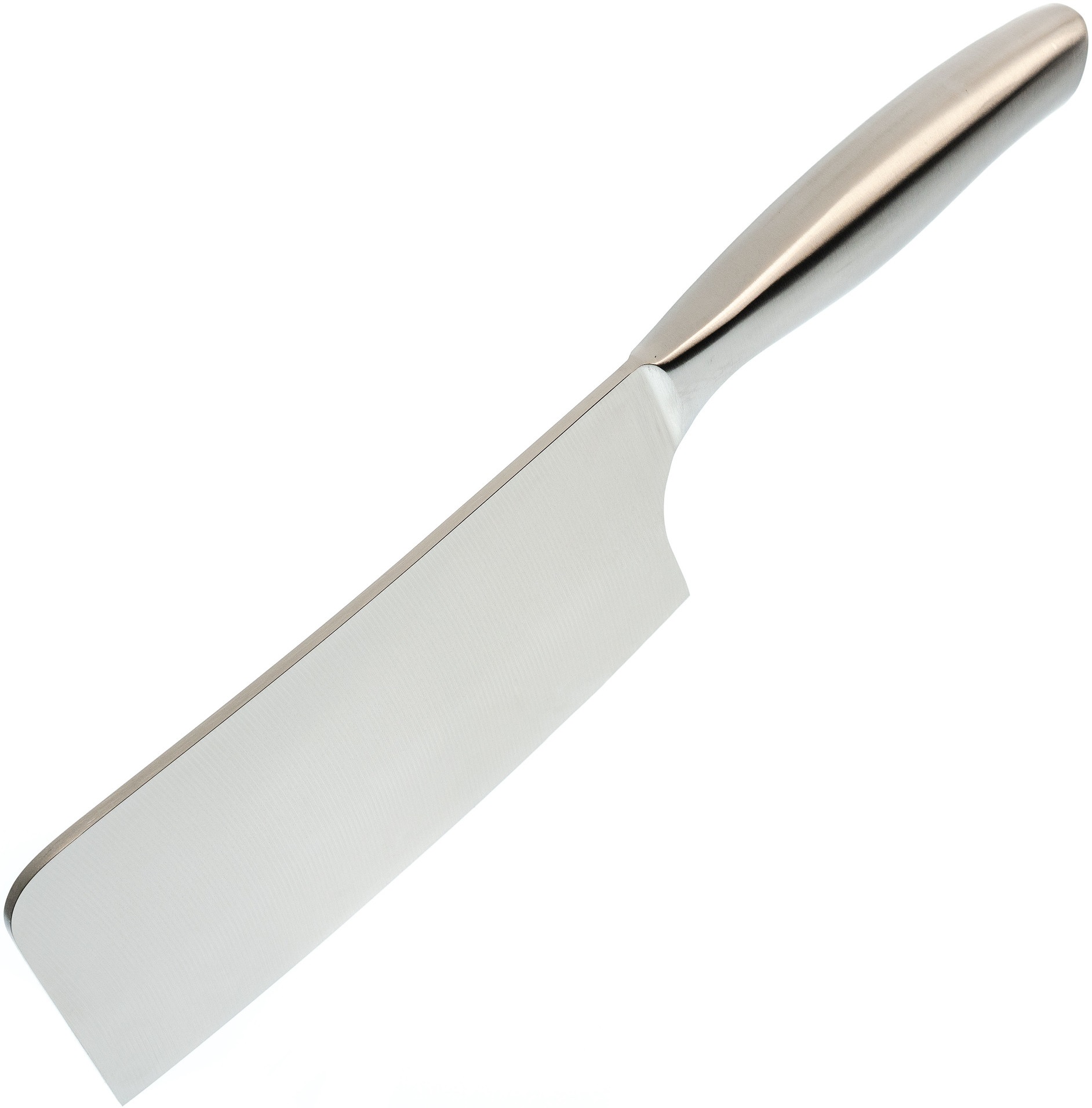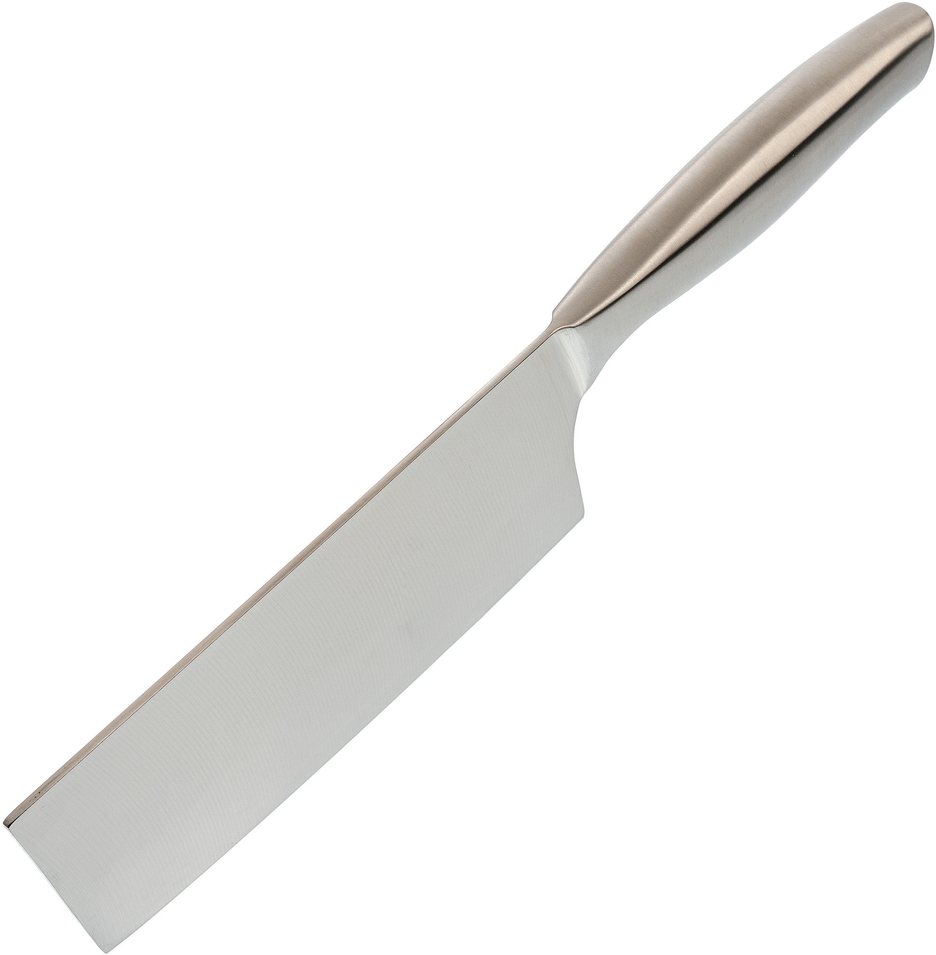 Этот нож имеет довольно широкое лезвие, которое поможет нарезать мясо, овощи или другие продукты аккуратными ломтиками. Или мелко порубить. При этом его тыльная сторона может послужить «молотком» для отбивания мяса. Поэтому такой нож является одним из основных инструментов для профессиональных поваров.