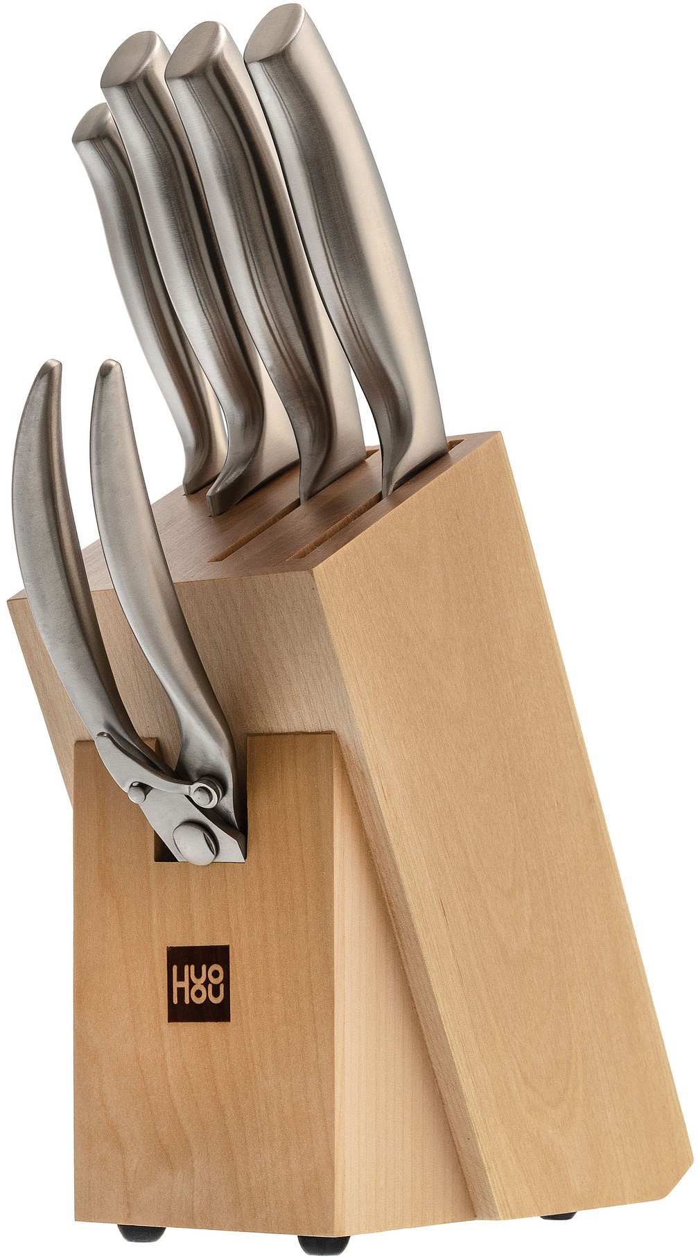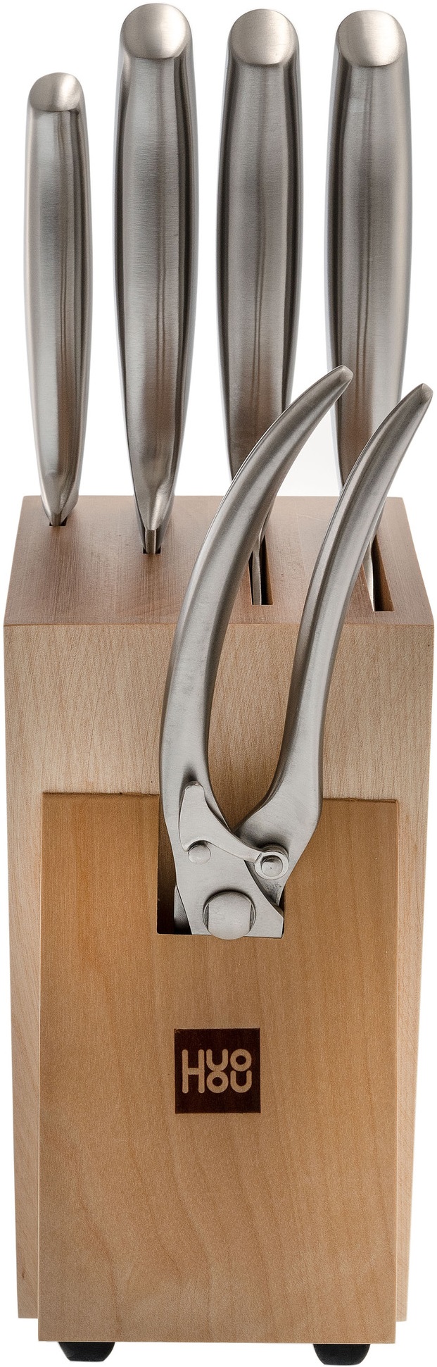 Для безопасного и правильного хранения ножей в комплекте с ними идет деревянная подставка. Она не только органично дополняет общий дизайн комплекта, но и дает возможность держать инструменты всегда под рукой. В таком оформлении набор ножей HuoHou будет отлично смотреться в любом интерьере и станет оригинальным акцентом вашей кухни.