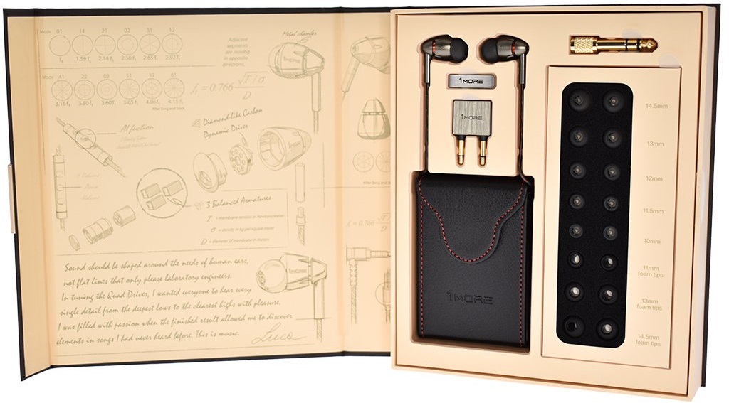 В комплекте к наушникам 1MORE Quad Driver In-Ear Headphones прилагаются шесть пар силиконовых насадок-амбушюров, переходник на 3-pin Jack 6.35 мм, адаптером для использования в самолете, клипсой для крепления, а также твердым мини-кейсом с магнитным клапаном.