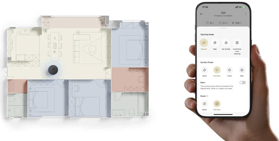 Пылесос D20 выделяется мощностью всасывания до 13 000 Па, что позволяет ему эффективно справляться с любыми типами загрязнений. Оснащённый инновационной щёткой HyperStream Detangling DuoBrush, он легко удаляет шерсть и другие виды грязи с любых поверхностей, не повреждая их. Благодаря интеллектуальной технологии Pathfinder, пылесос автоматически составляет карту вашего дома, что обеспечивает максимально эффективное и точное очищение в каждом уголке.
