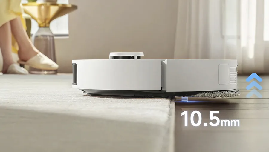 Для достижения эталонного качества влажной уборки модель оснащена функцией DuoScrub, использующей две мощные вращающиеся швабры, которые работают под постоянным давлением, эффективно имитируя интенсивное ручное оттирание. Электронная система дозирования воды с прецизионной настройкой на 32 уровня позволяет идеально адаптировать влажность насадок под конкретный тип покрытия — от деликатного паркета до износостойкого керамогранита. При заезде на ковры Dreame L50 Ultra CE проявляет исключительную «сообразительность»: встроенный ультразвуковой датчик дает команду мгновенно поднять швабры на 10,5 мм. Это полностью исключает намокание ворса и позволяет роботу одновременно переключиться в режим максимального всасывания для глубокой чистки ковра, обеспечивая бесшовный переход между сухой и влажной уборкой.