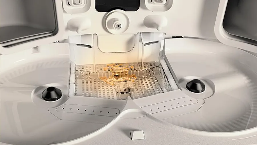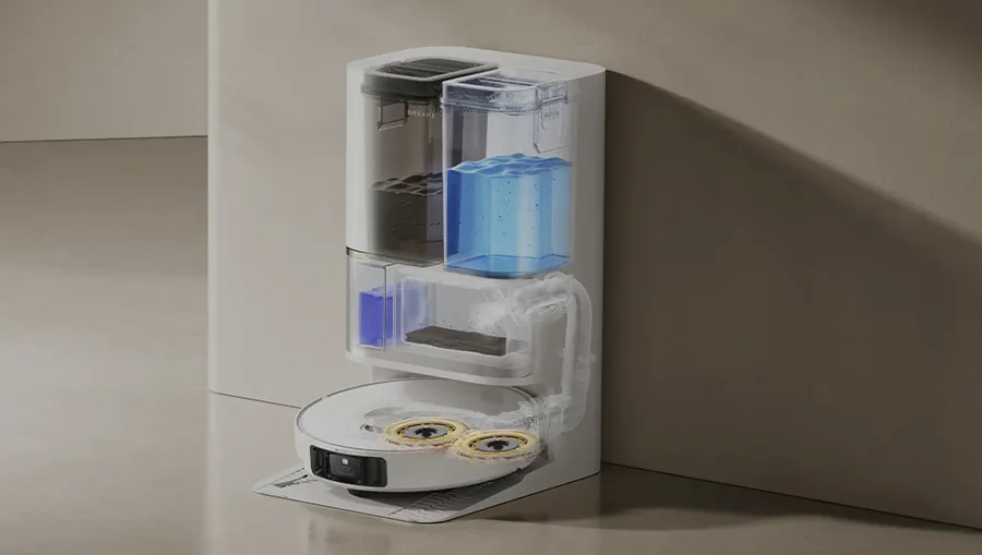 Система All-in-one PowerDock предлагает комплексное решение для автоматизации уборки, обеспечивая безупречный порядок без участия человека. После завершения уборки она автоматически опустошает контейнер для сбора пыли, что исключает необходимость вручную удалять загрязнения. Затем устройство промывает и сушит насадки для мытья пола, используя горячую воду, что предотвращает размножение бактерий и продлевает срок службы насадок. Кроме того, система автоматически пополняет запас воды в резервуаре робота-пылесоса, что позволяет поддерживать непрерывную работу без перерывов на дозаправку.