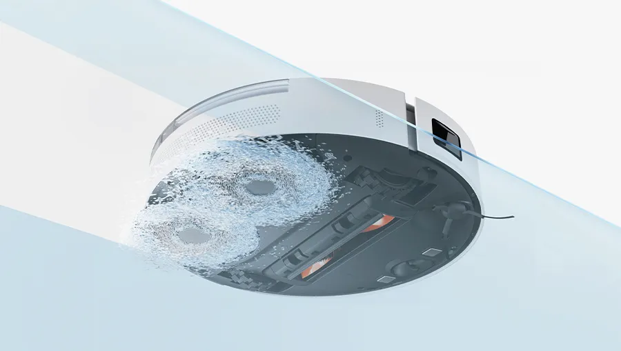 Пылесос оборудован двумя вращающимися подушечками-швабрами. Они изготовлены из мягкого материала, отлично удерживающего оптимальный уровень влаги без образования луж и разводов на напольных покрытиях любого типа. Такая конструкция обеспечивает более эффективную очистку: двойные подушечки быстро вращаются, имитируя давление как при ручной чистке, эффективно удаляя следы обуви и лап, пятен от разлитого кофе или соуса.