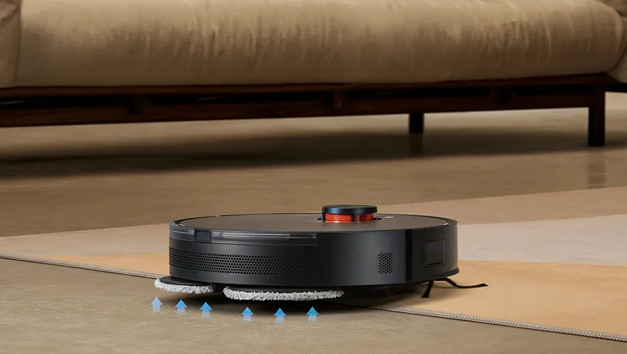 Система интеллектуального обнаружения ковровых покрытий обеспечивает автоматический подъем подушечек встроенных швабр. Робот-пылесос определяет наличие ковра в зоне уборки с помощью ультразвукового датчика. Попадая на тканевое напольное покрытие, устройство активирует более сильное всасывание, эффективно удаляя пыль и при этом не увлажняя ковер.
