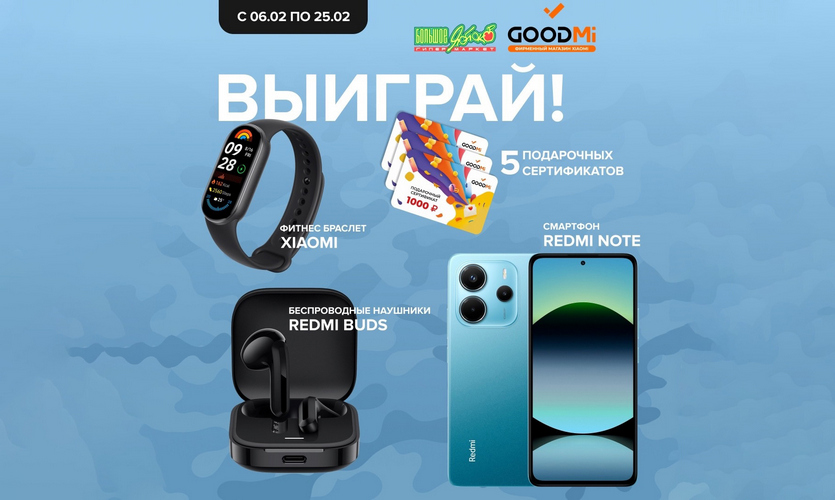 5 подарочных сертификатов от магазина Xiaomi GOODMi.ru, номиналом 1000₽