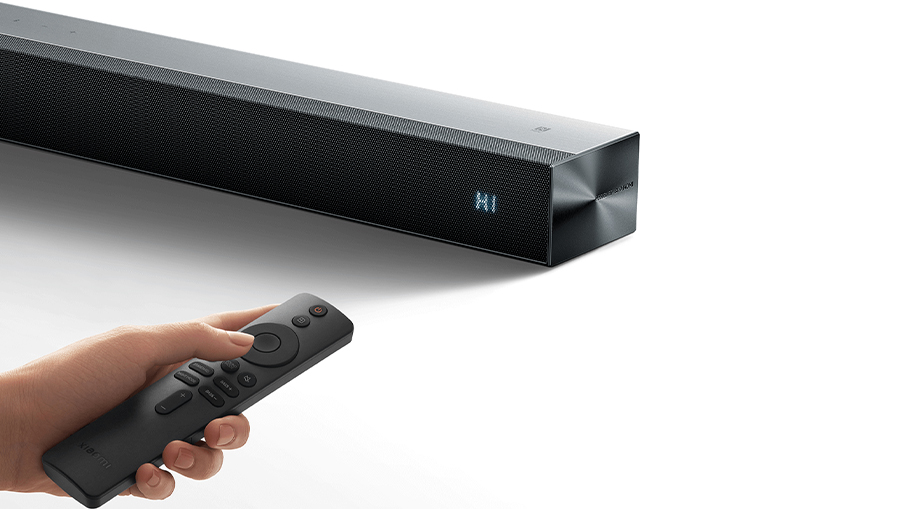 Инфракрасный пульт предлагает вам интуитивное управление всеми функциями саундбара: вы можете легко переключаться между аудиорежимами, выбирать источник сигнала — будь то HDMI, Bluetooth или оптика — и настраивать звучание под текущий сценарий. Всё это — одним нажатием. Пульт выполнен в стильном корпусе, он удобно ложится в руку, благодаря чему управление становится быстрым и точным.