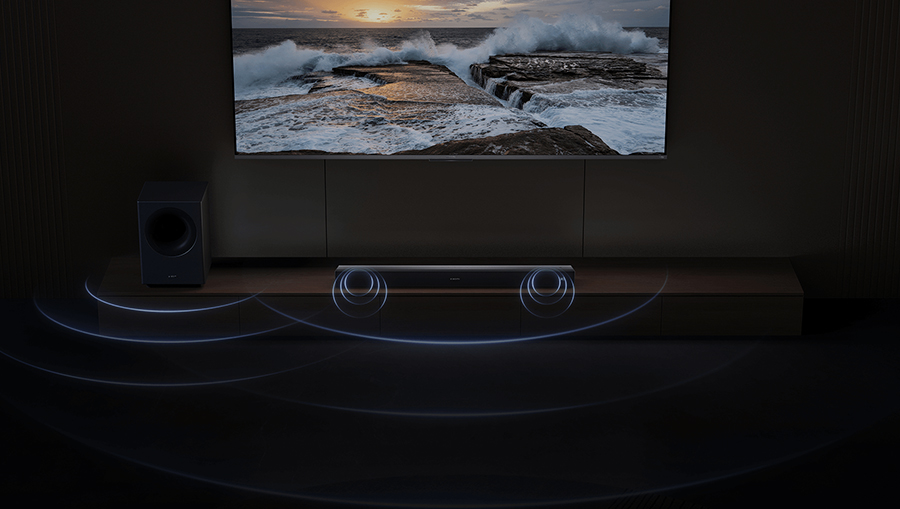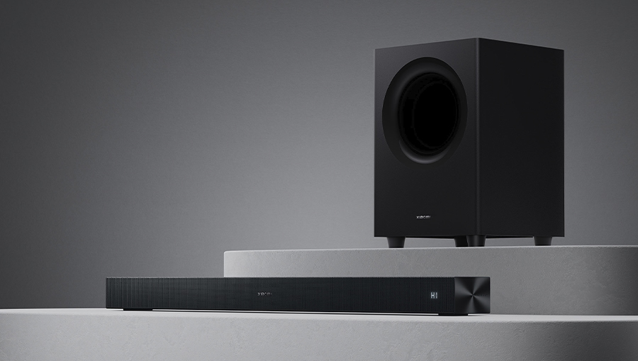 Xiaomi Soundbar Pro 2.1 ch — это не просто техника, а элемент стильного пространства. Его корпус выполнен из матового металла с оригинальной текстурой, что придаёт устройству утончённый и современный облик. Скрытый дисплей не нарушает визуальную гармонию, а металлическая решётка и верхние кнопки управления подчёркивают продуманность конструкции. Вы можете разместить саундбар на столе или закрепить на стене — оба варианта поддерживаются. Беспроводной сабвуфер предназначен для настольной установки и органично дополняет систему.