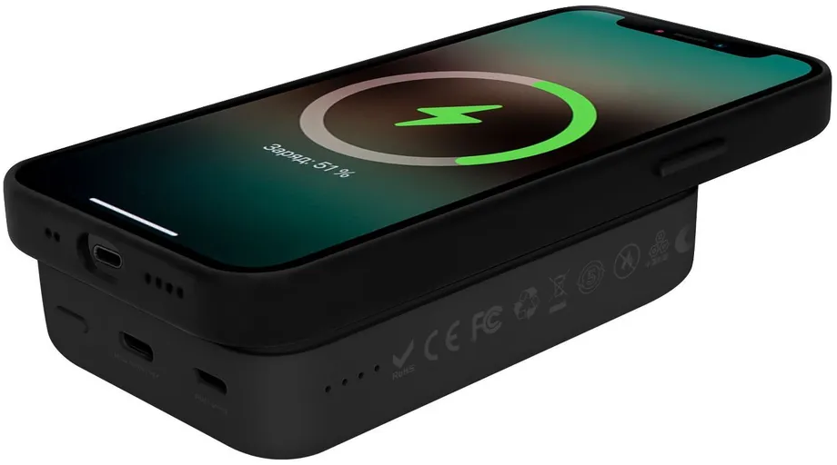 Новая технология беспроводной зарядки Apple MagSafe позволяет примагничивать Power Bank к совместимому смартфону Apple для зарядки смартфона без проводов по стандарту Qi. Встроенные магниты фиксируют зарядное устройство на задней панели смартфона, зарядка выполняется быстро с мощностью до 15 Вт. Вы можете с комфортом смотреть фильмы, проводить онлайн-конференции, а в это время смартфон будет заряжаться Высокая мощность в 15Вт позволяет зарядить iPhone 12й серии с 0 до 50% всего за 30 минут при использовании MagSafe.